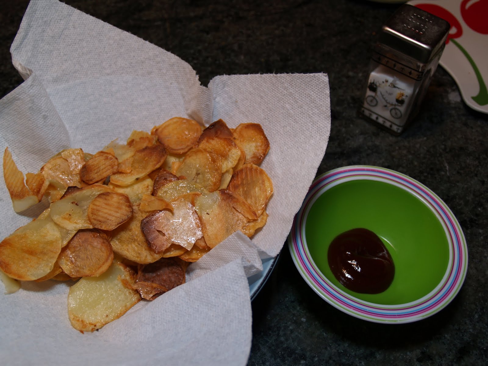 Last week, the kids and I enjoyed homemade potato chips. They were relatively quick to make: peel and slice (using a mandolin) a bunch of baby gold potatoes; coat slices with olive oil; place, in a single layer, on a cookie sheet; salt; and bake at 375 degrees F until crispy. Add more salt to taste, and enjoy. Luke finds them especially delicious when dipped in Sweet Baby Ray's Barbeque Sauce.